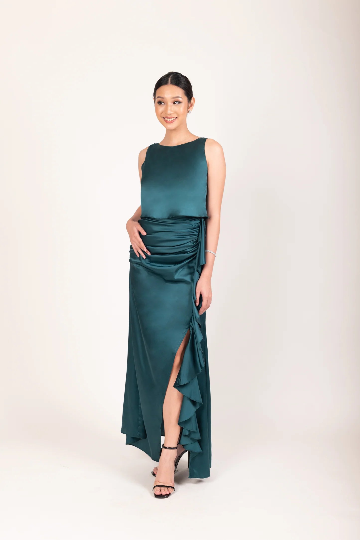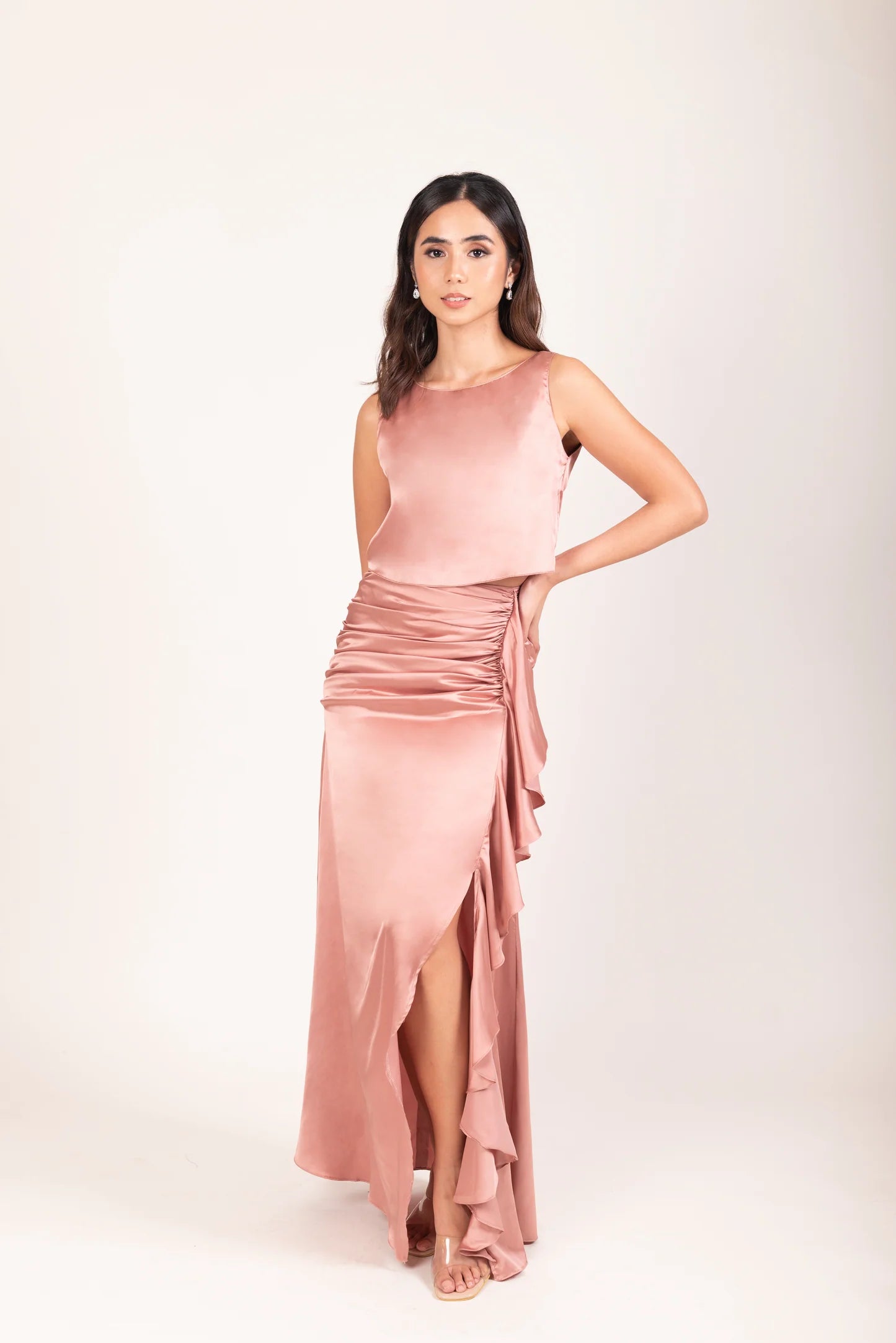 HALTER CROPPED TOP WITH DRAPED SKIRT WITH SIDE SLIT