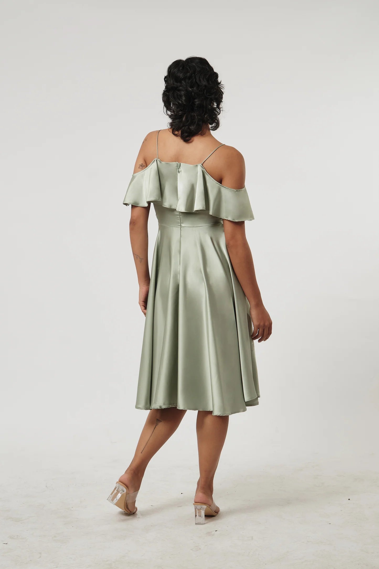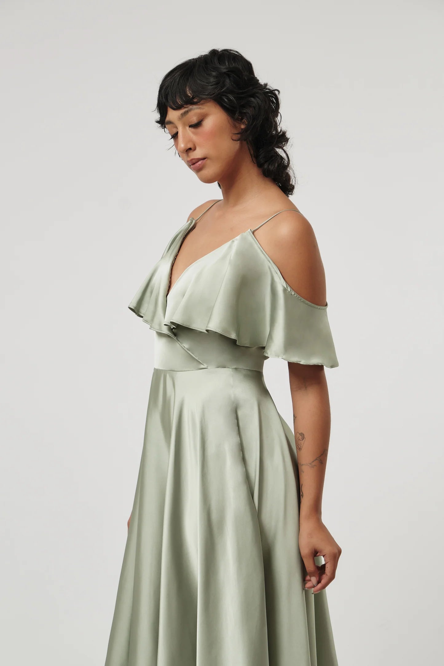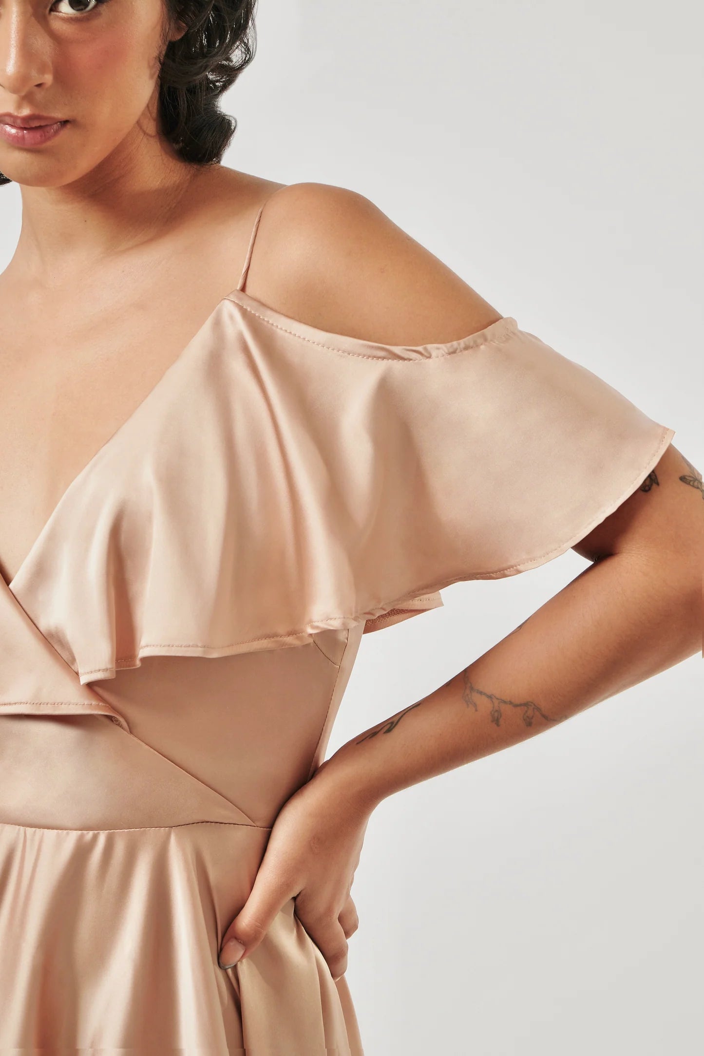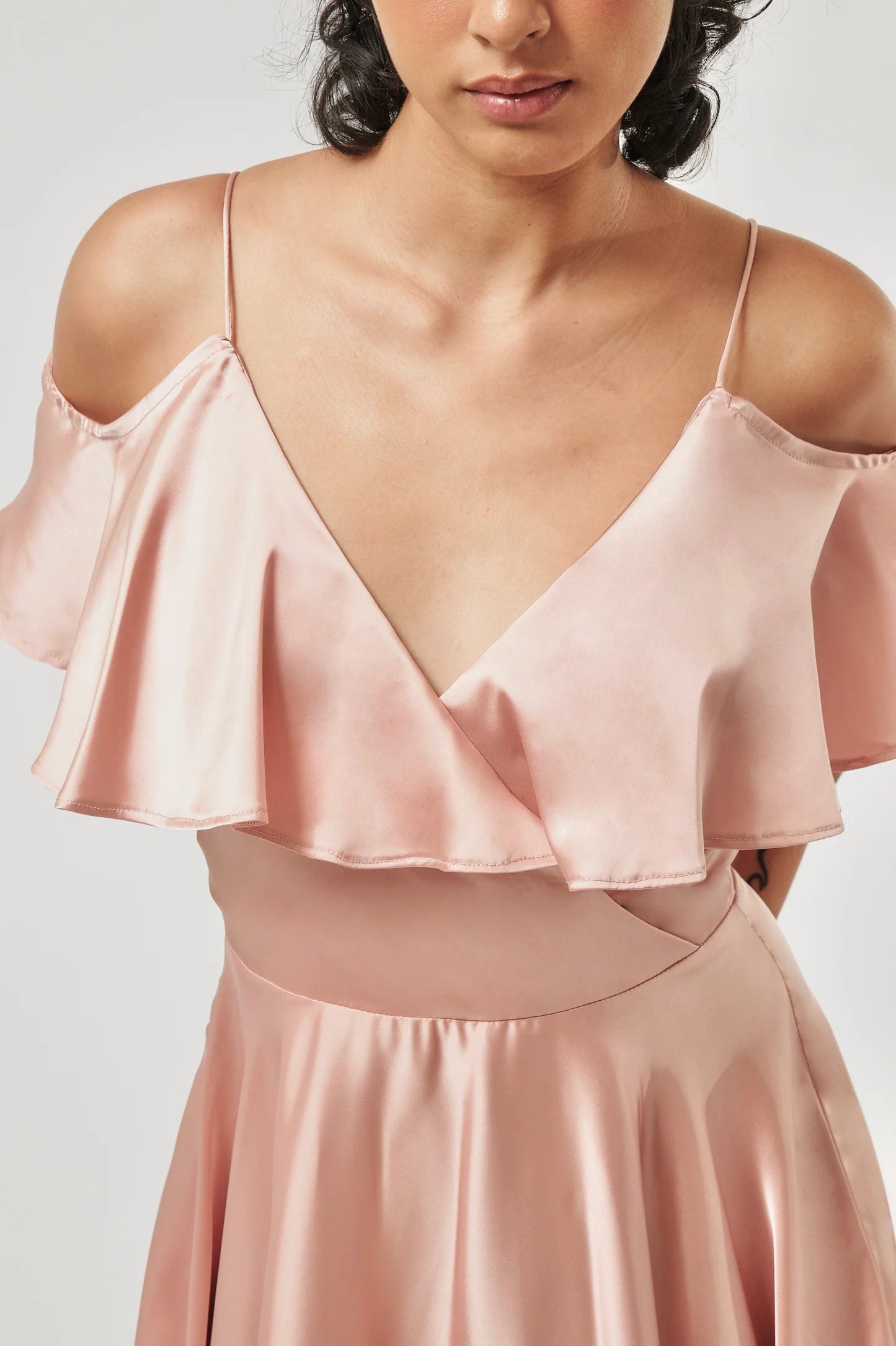 SPAGHETTI STRAPPED DEEP V-NECK COLD SHOULDER SILK SATIN DRESS