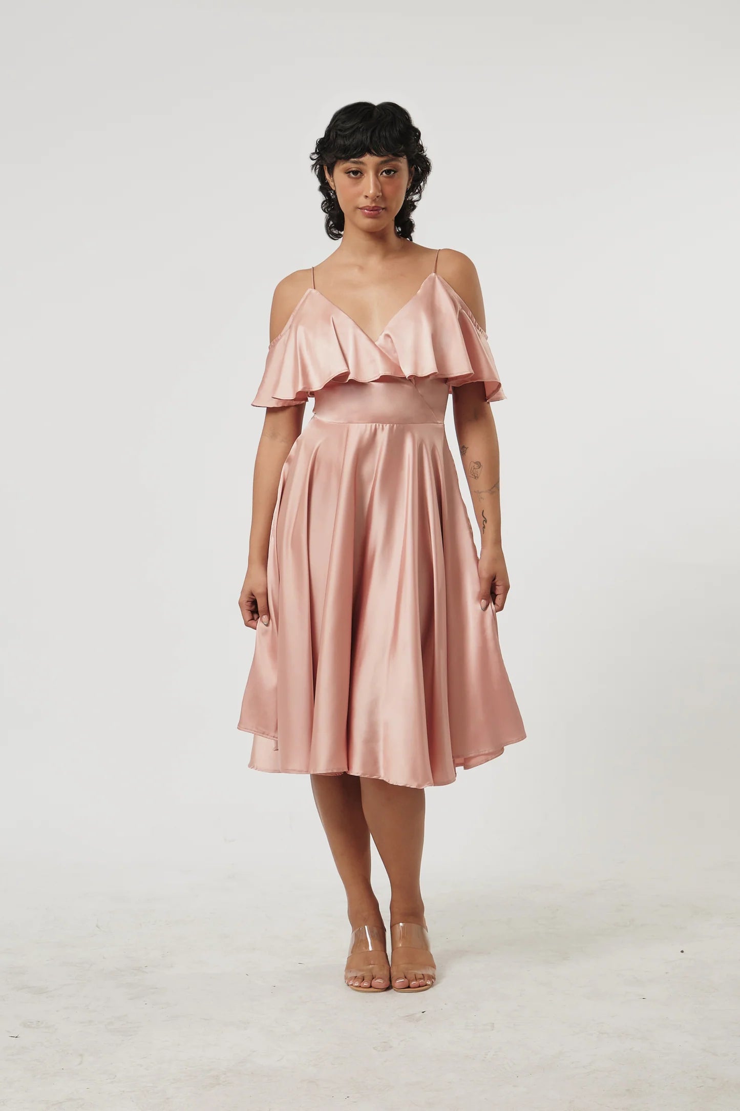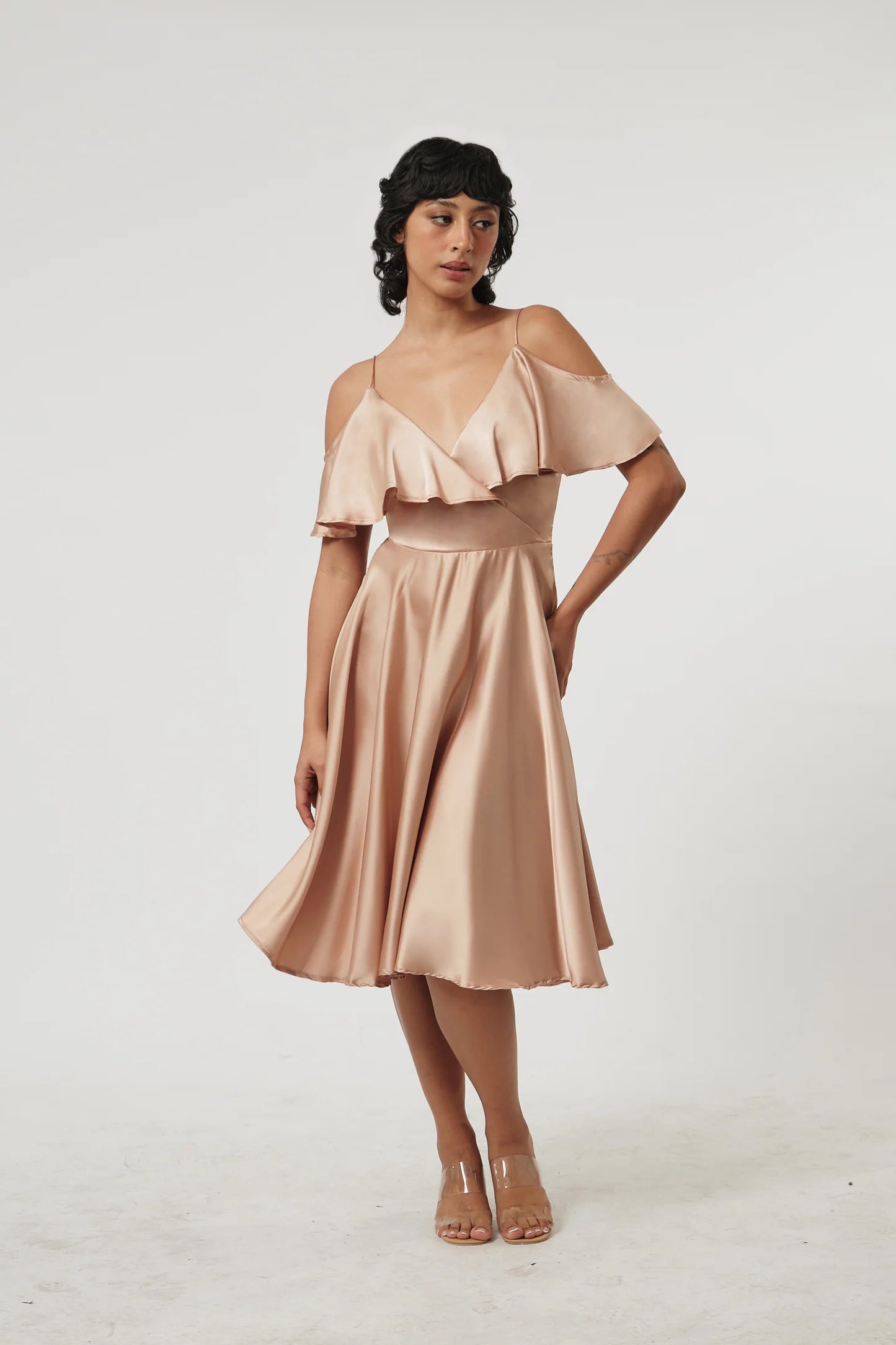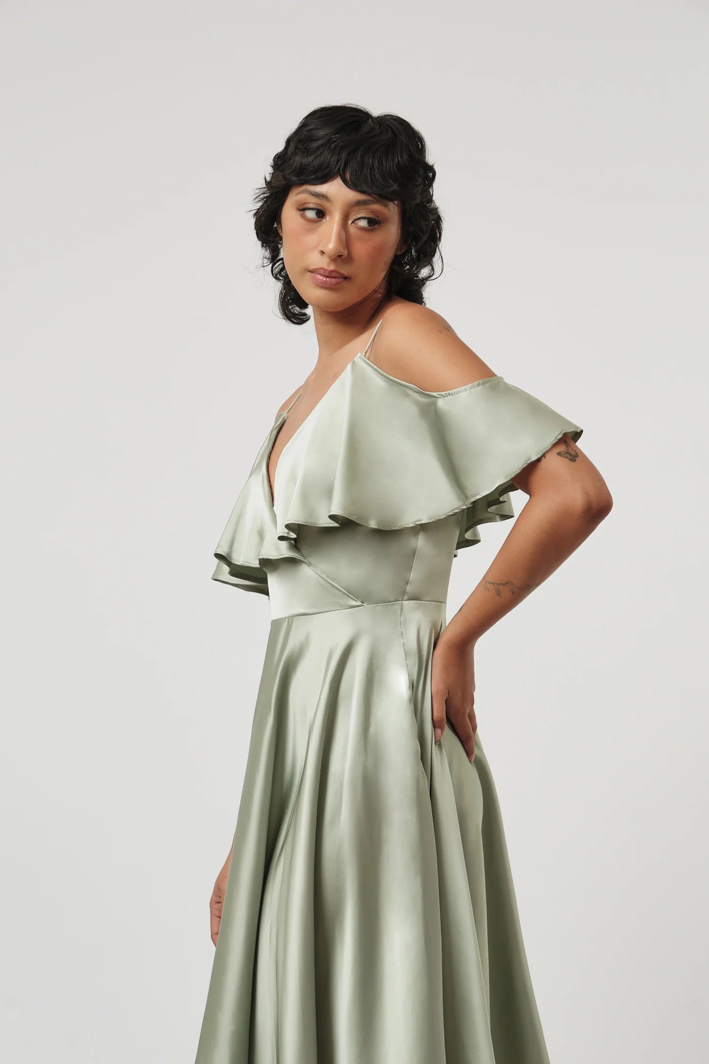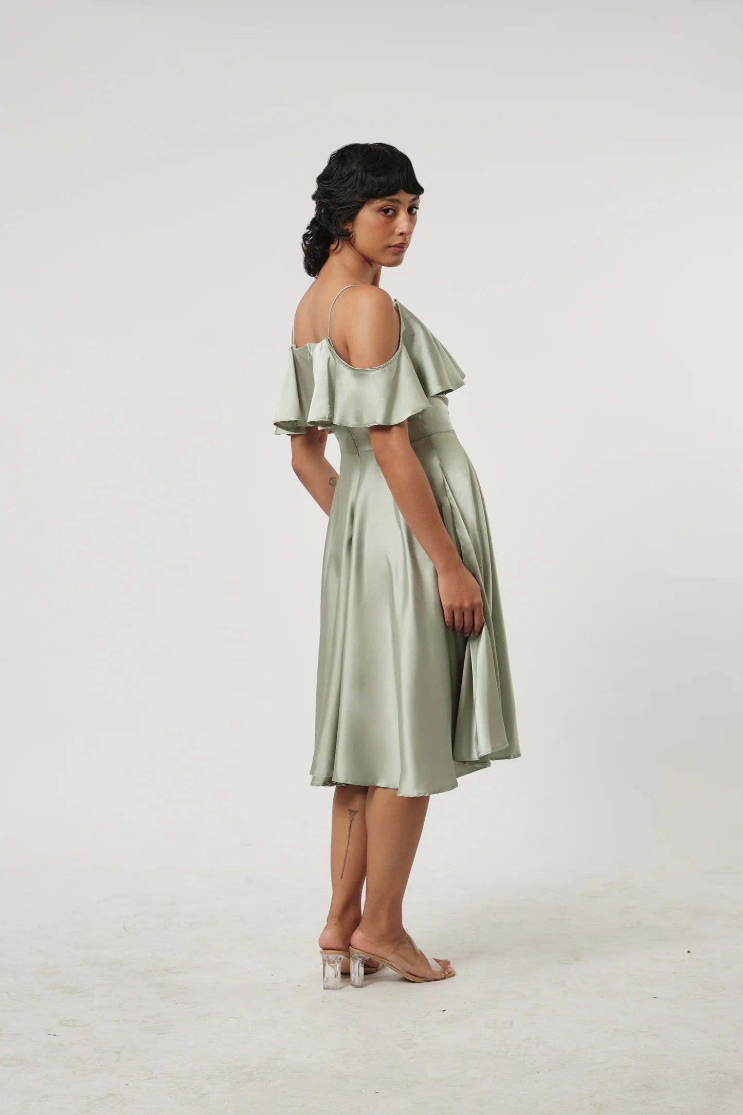 SPAGHETTI STRAPPED DEEP V-NECK COLD SHOULDER SILK SATIN DRESS