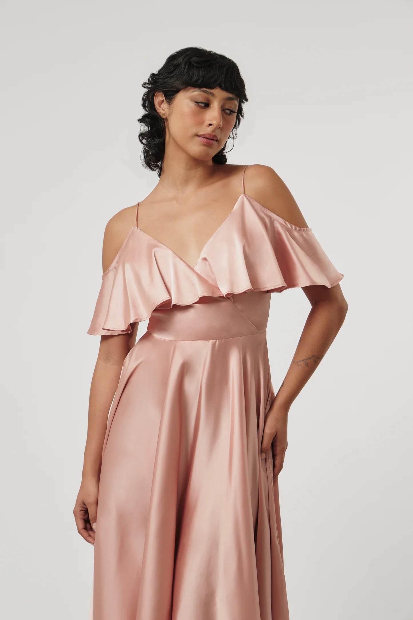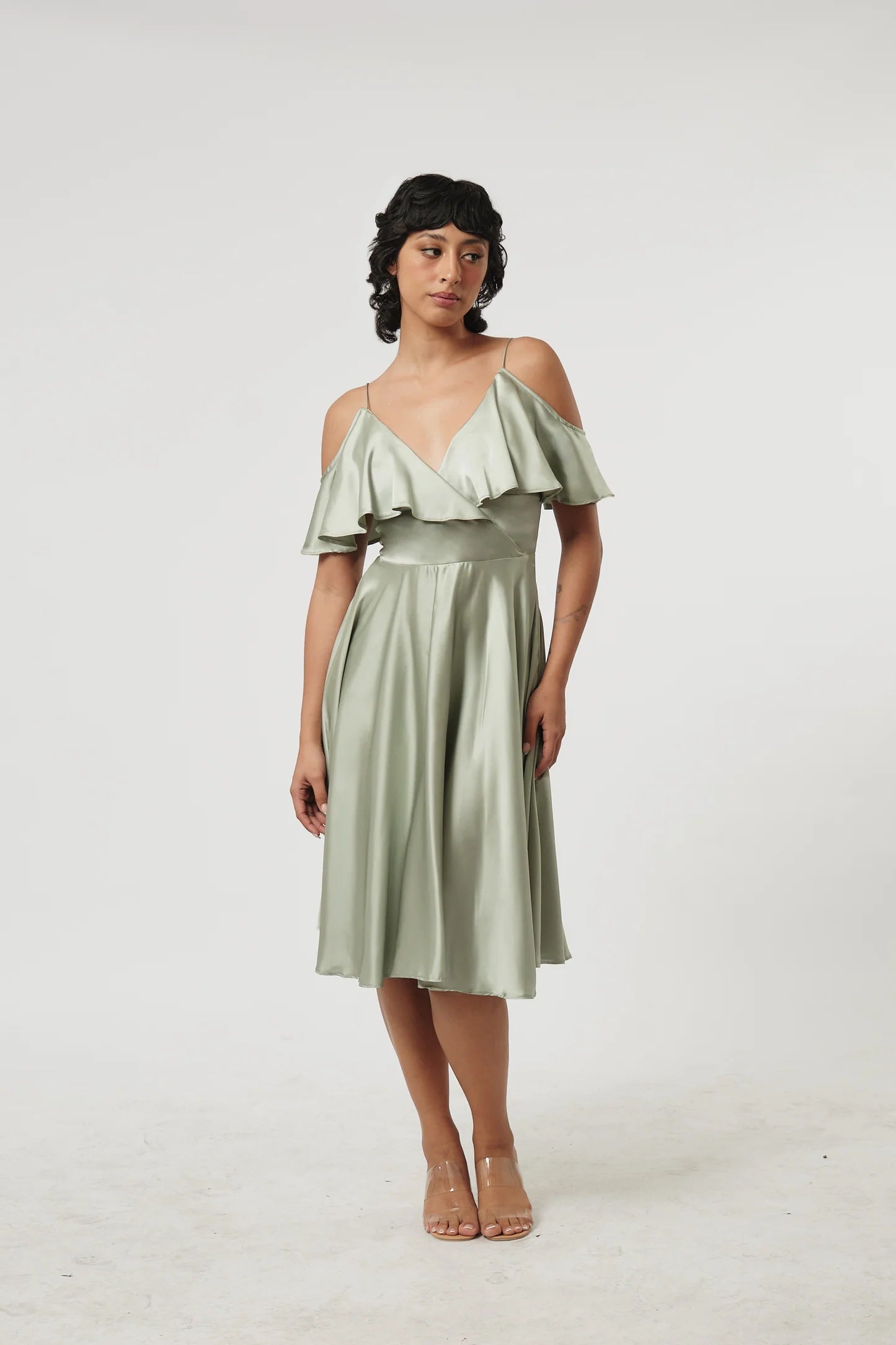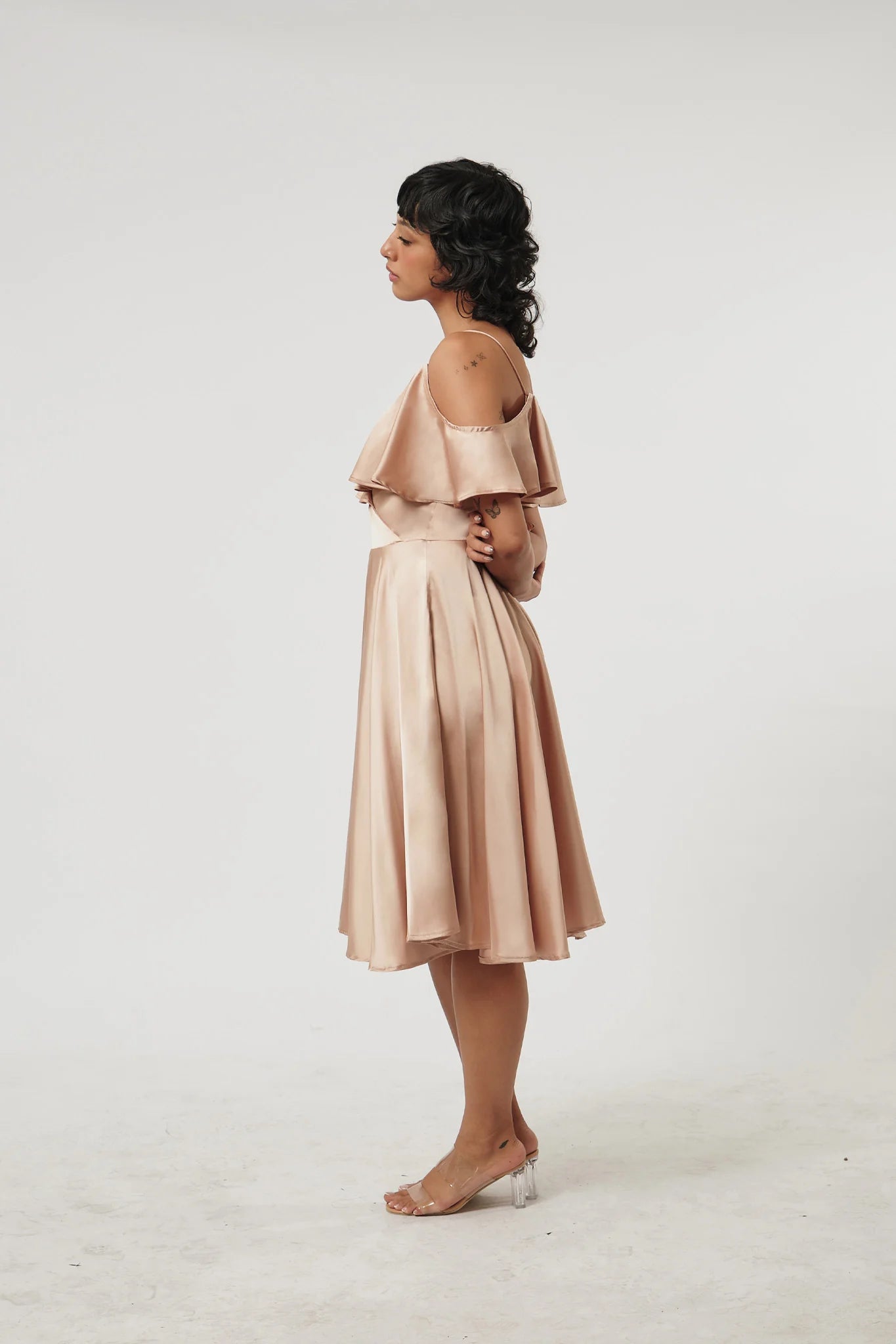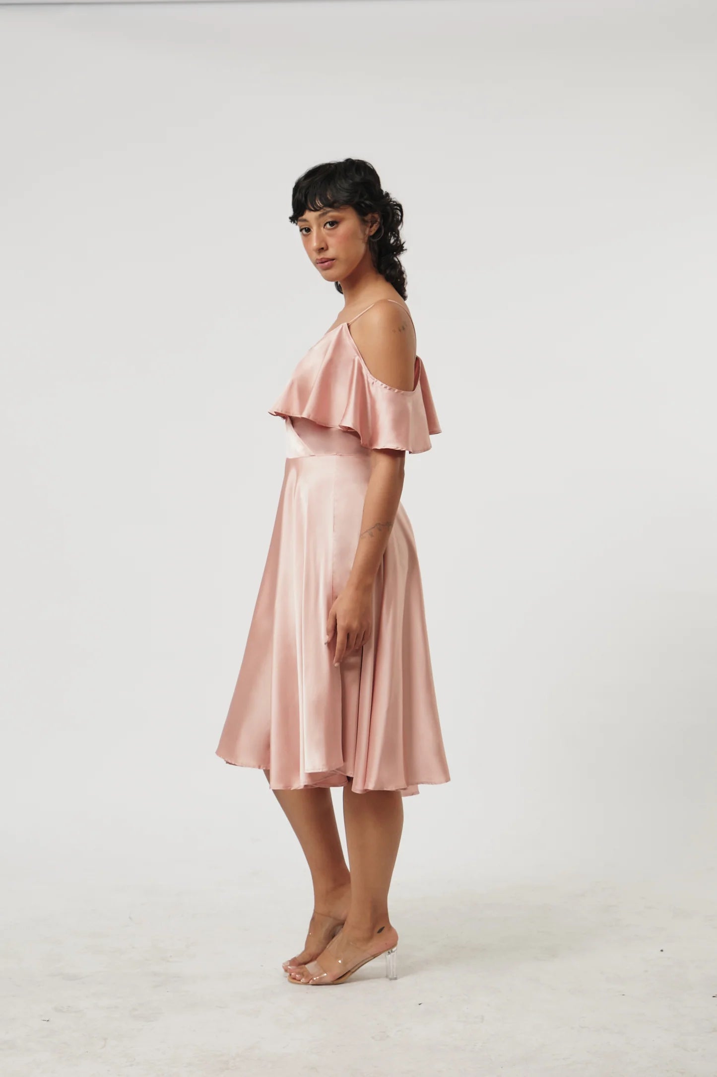 SPAGHETTI STRAPPED DEEP V-NECK COLD SHOULDER SILK SATIN DRESS