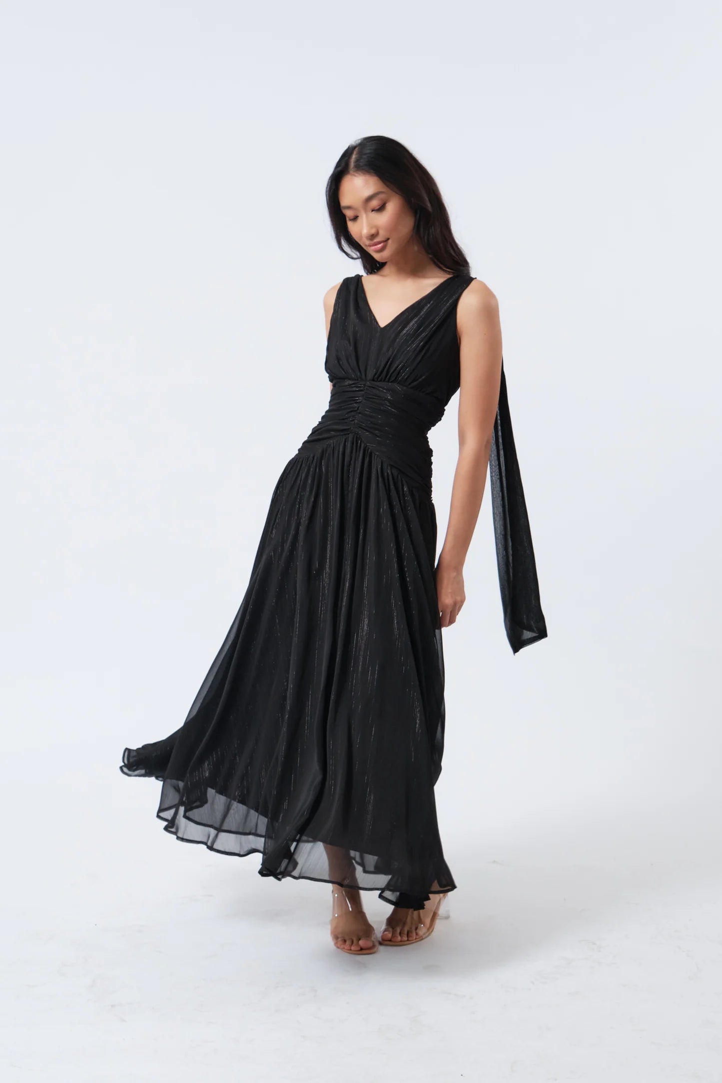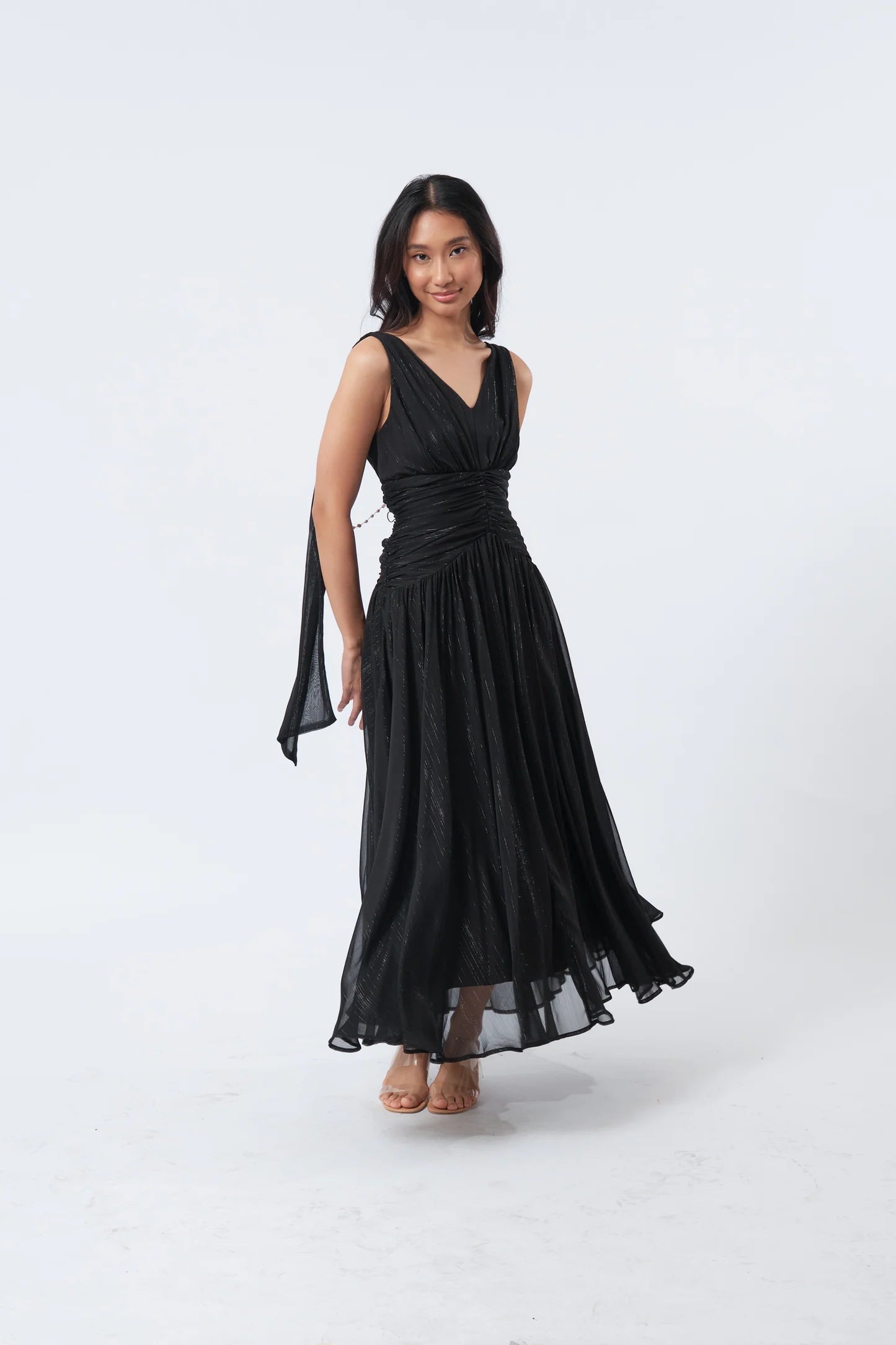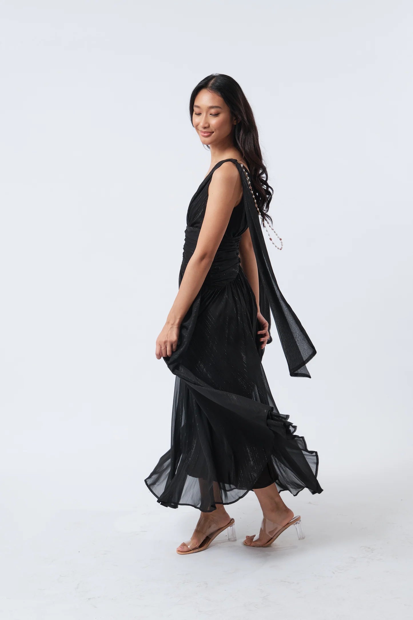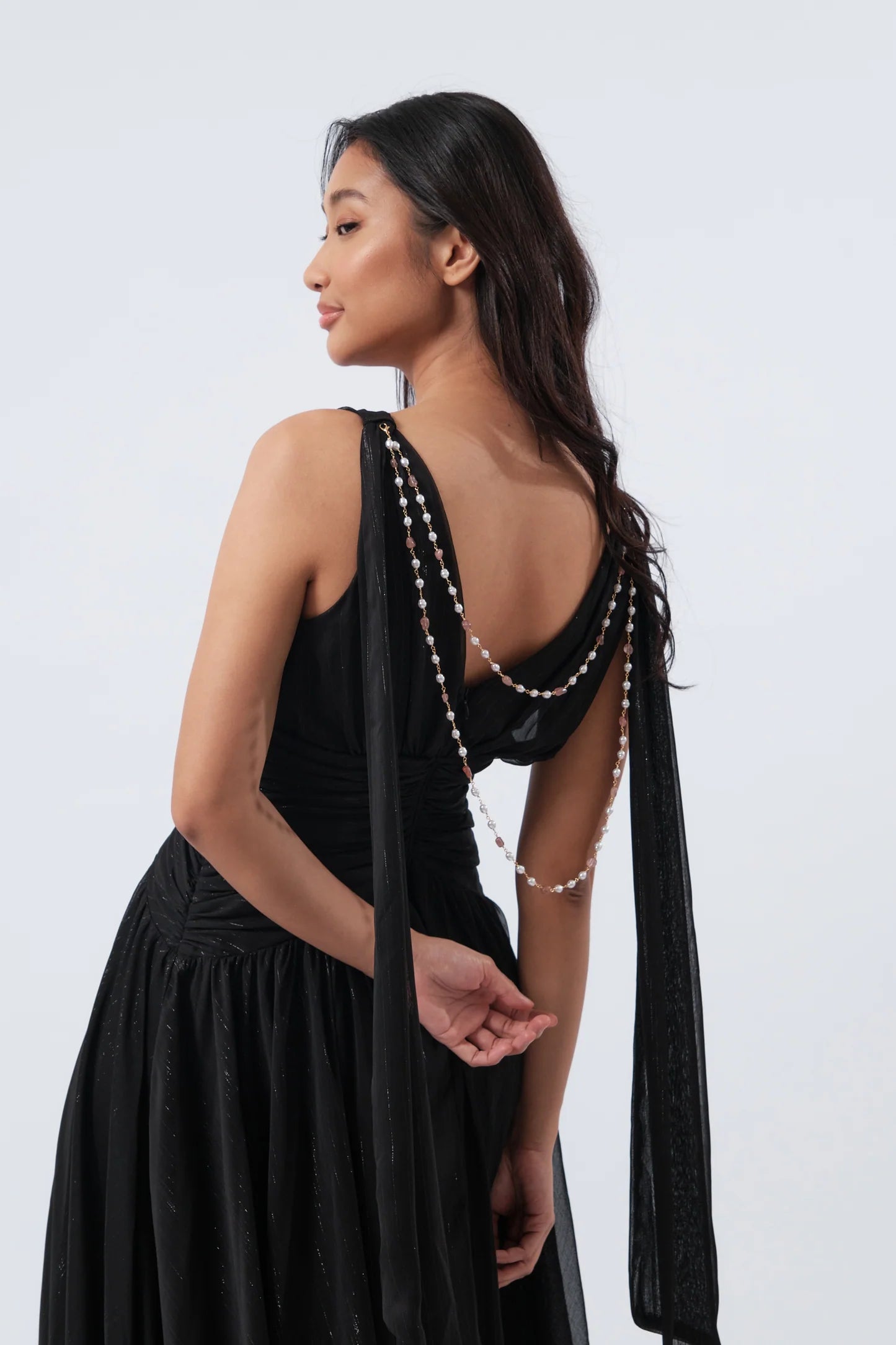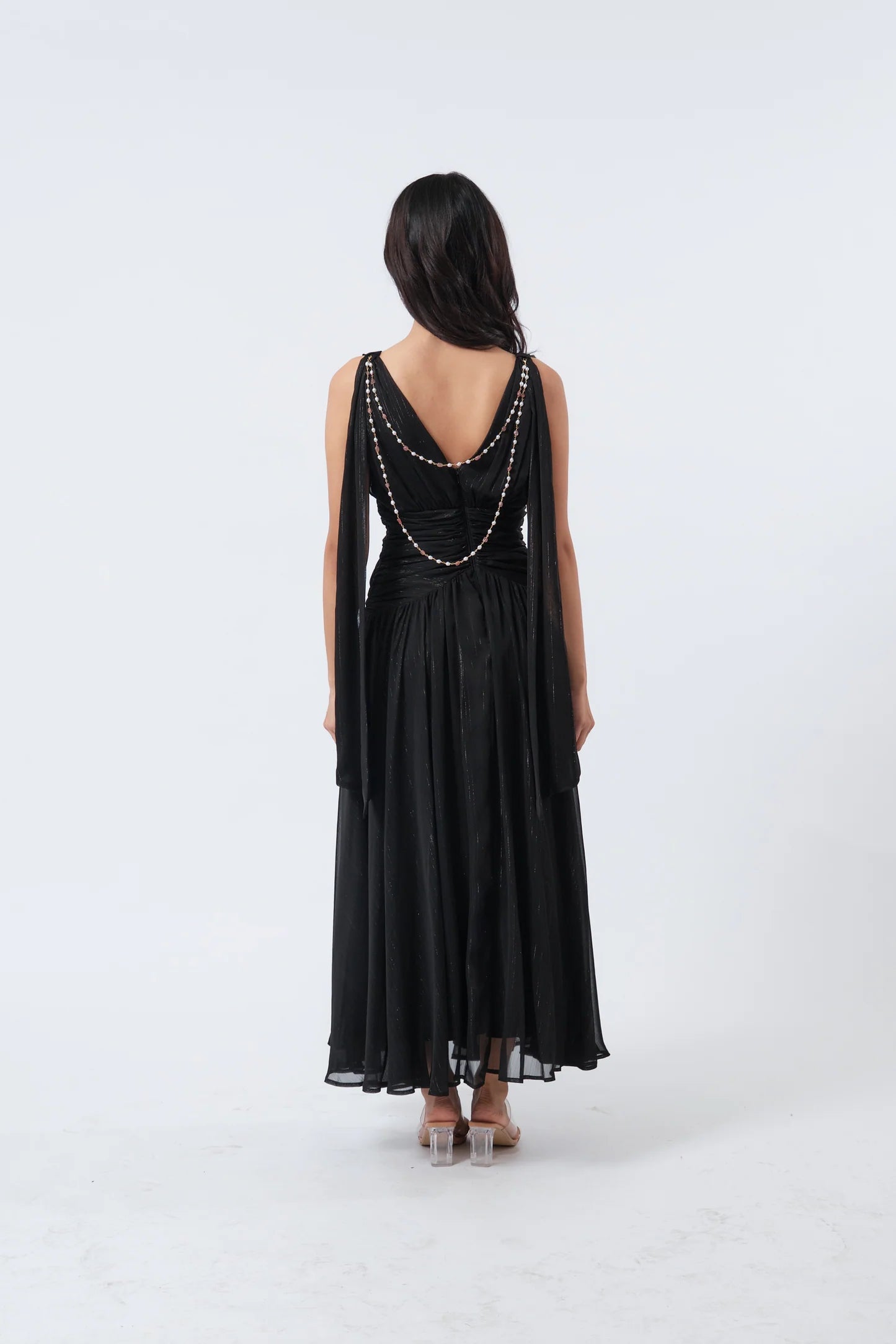 CINCHED WAIST MAXI DRESS WITH DETACHABLE PEARL EMBELLISHMENT