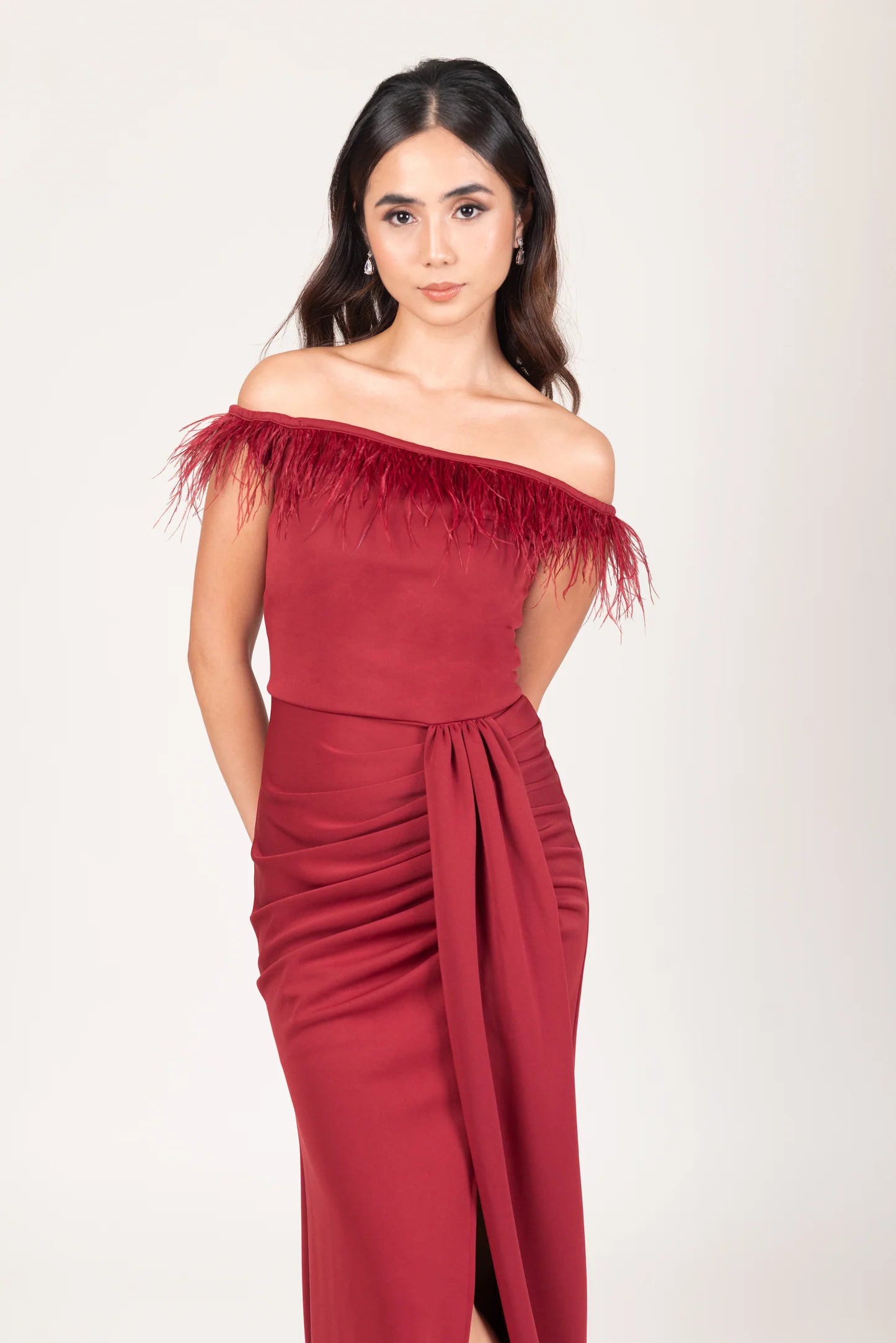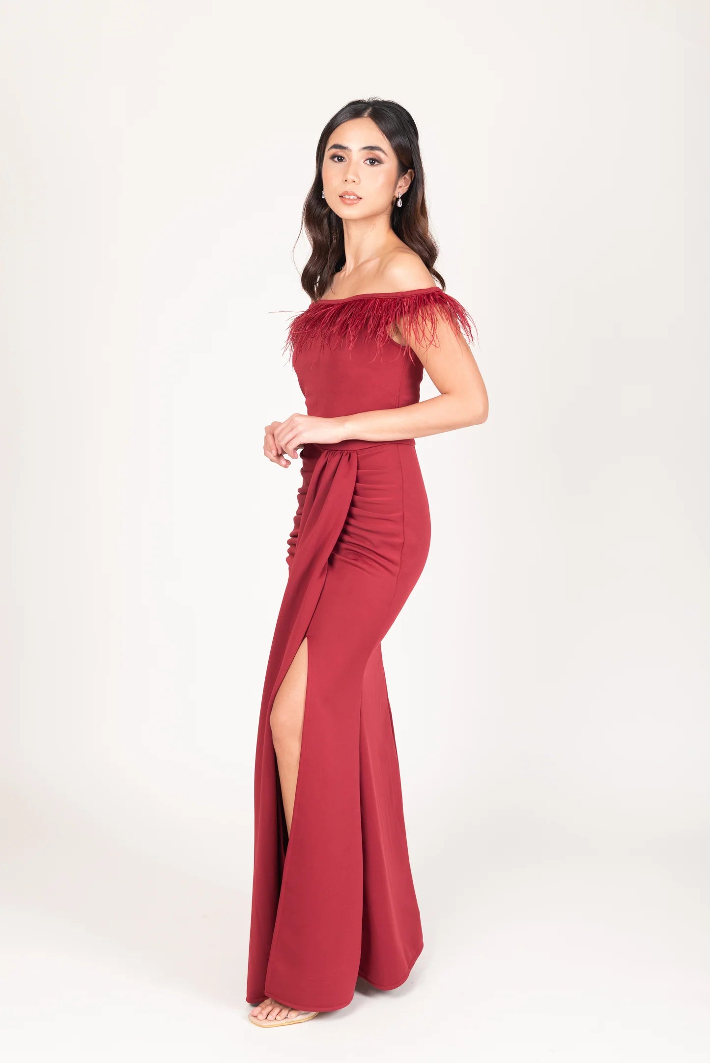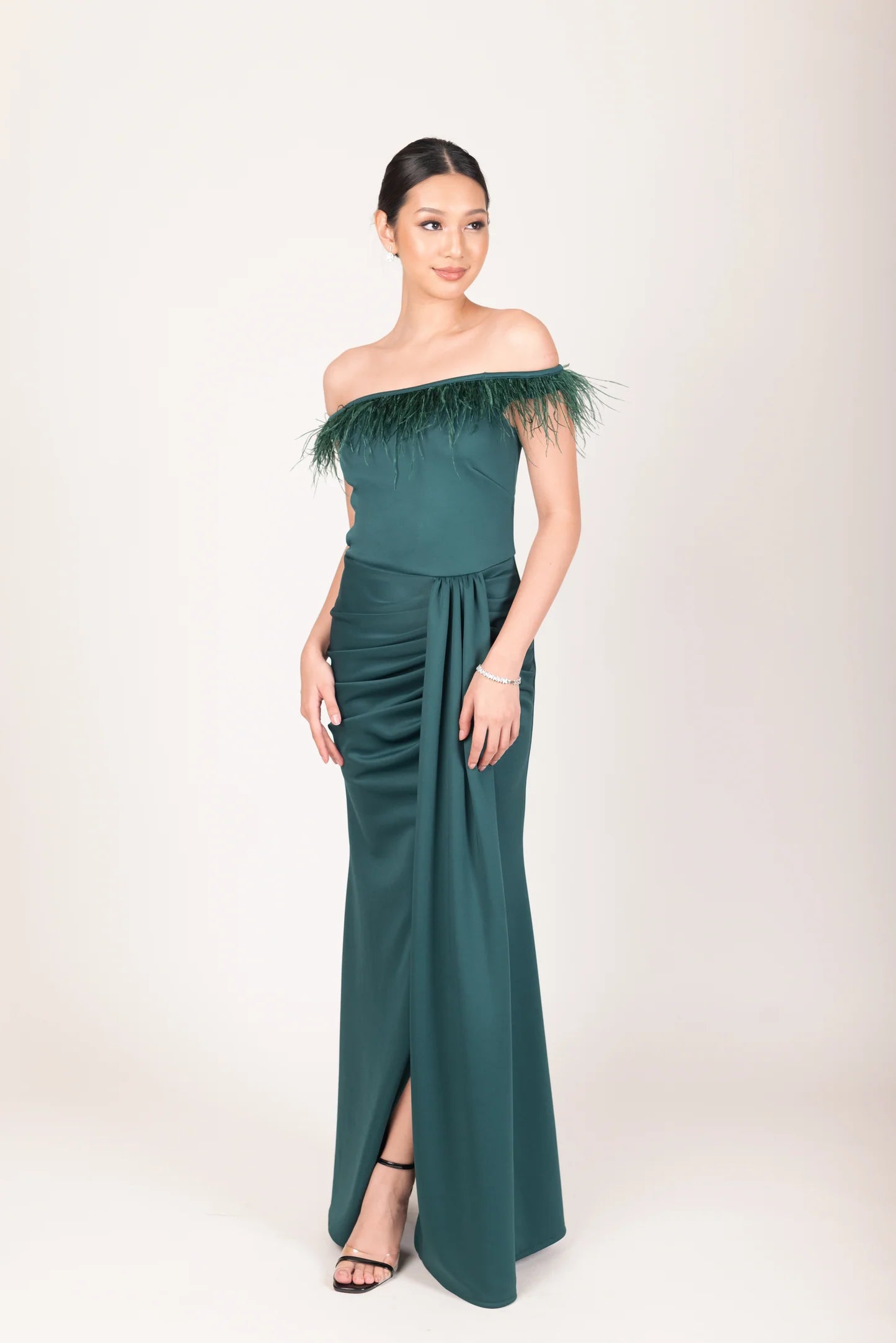 OSTRICH FEATHER OFF SHOULDER SERPENTINE GOWN
