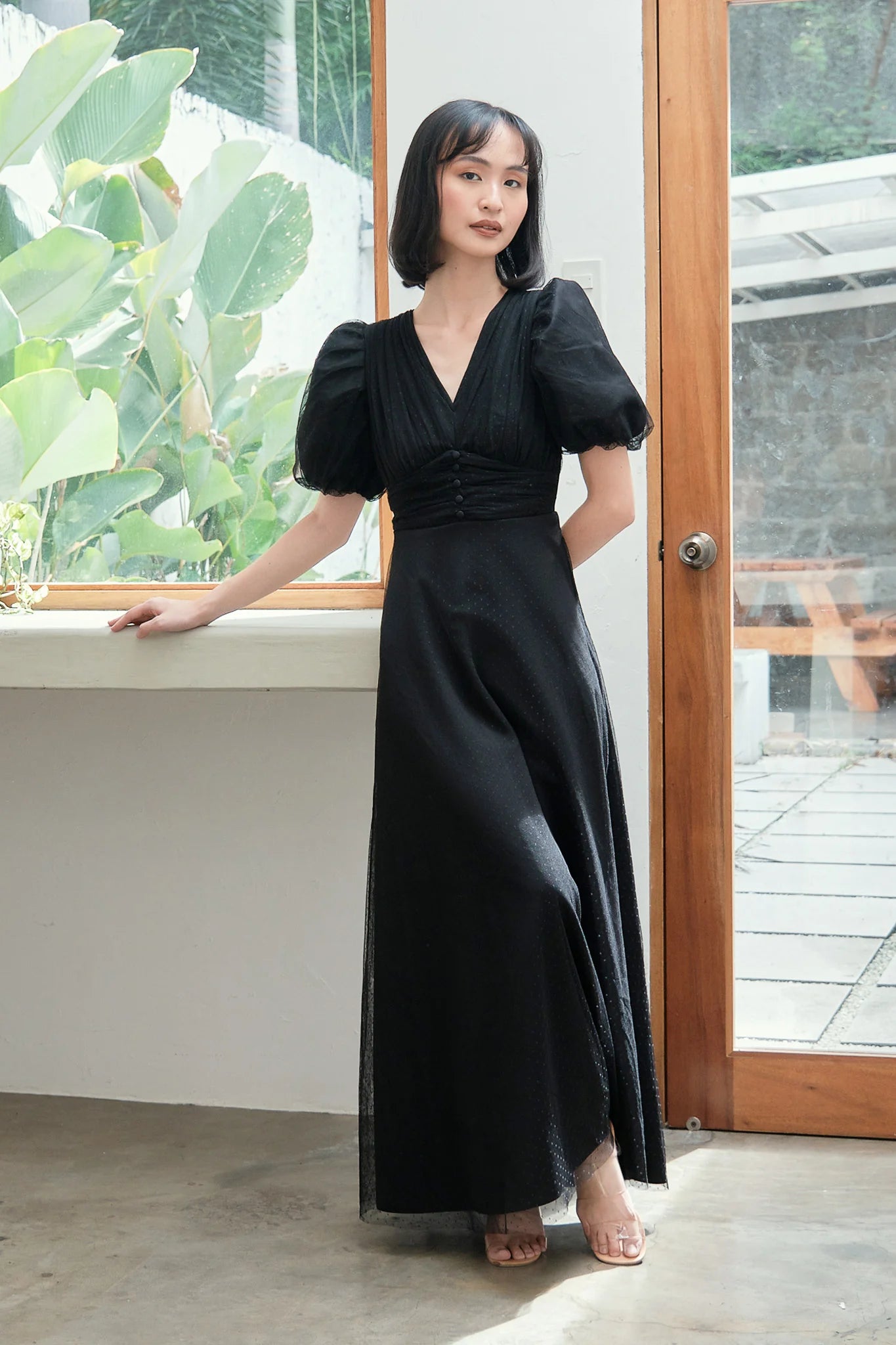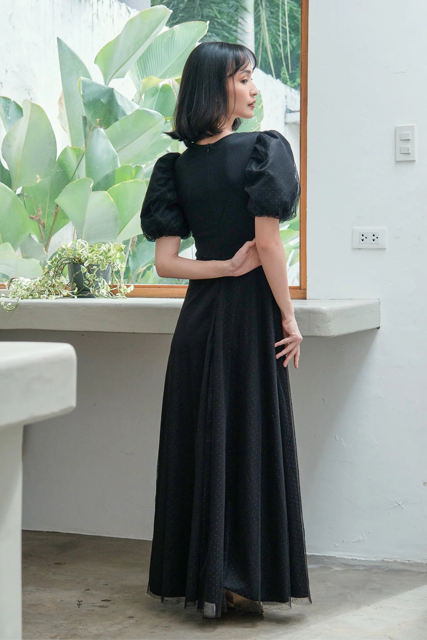PUFF SLEEVES FIT AND FLARE TULLE GOWN